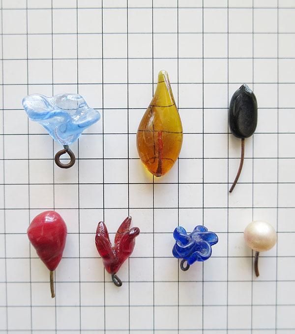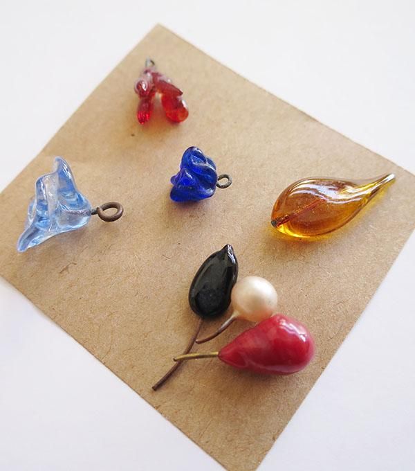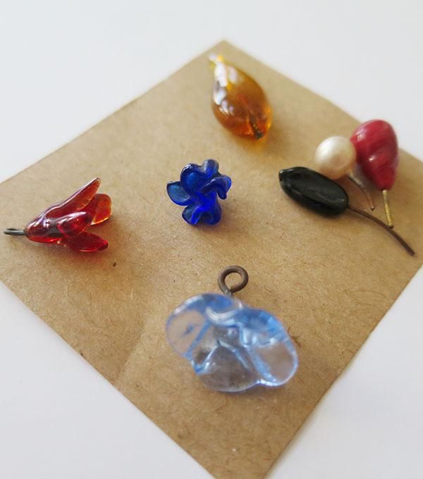 ガラスのモチーフにワイヤーが枝のように刺してあるので私たちは「枝付きパーツ」と呼んでいます。
